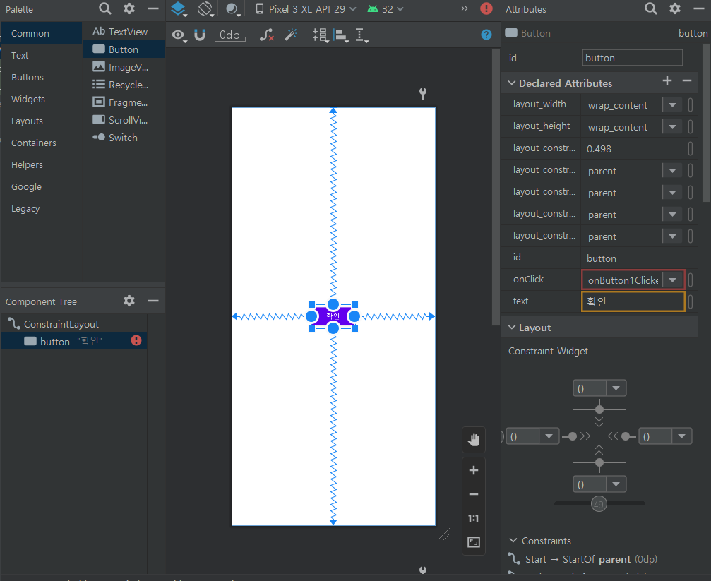 버튼은 activity_main.xml에서 버튼은 드래그하여 가운데 배치시켜 만들었다.