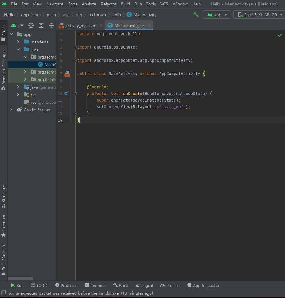 열려있는 탭을 보면 activity_main.xml파일과 MainActivity.java파일이 있다.