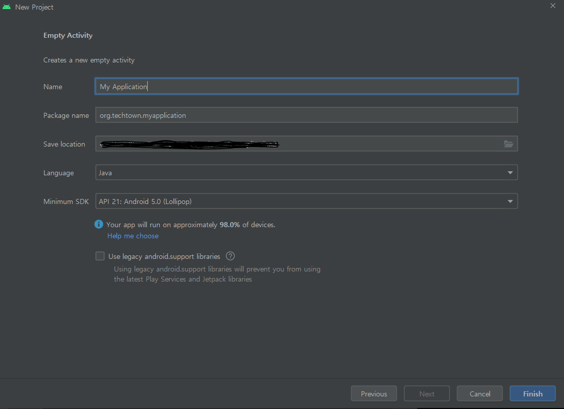 Name은 자신이 원하는데로 작성하면되고 Package name은 원래 com.sample.myapplication이라고 되어있는데 강의에 따라 org.techtown.myapplication으로 변경하여 진행했다.