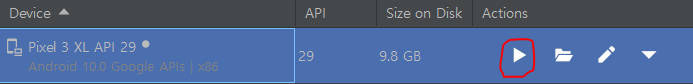 만들어졌다면 빨간색으로 표시된 화살표 버튼을 누르면 애뮬레이터가 열린다.