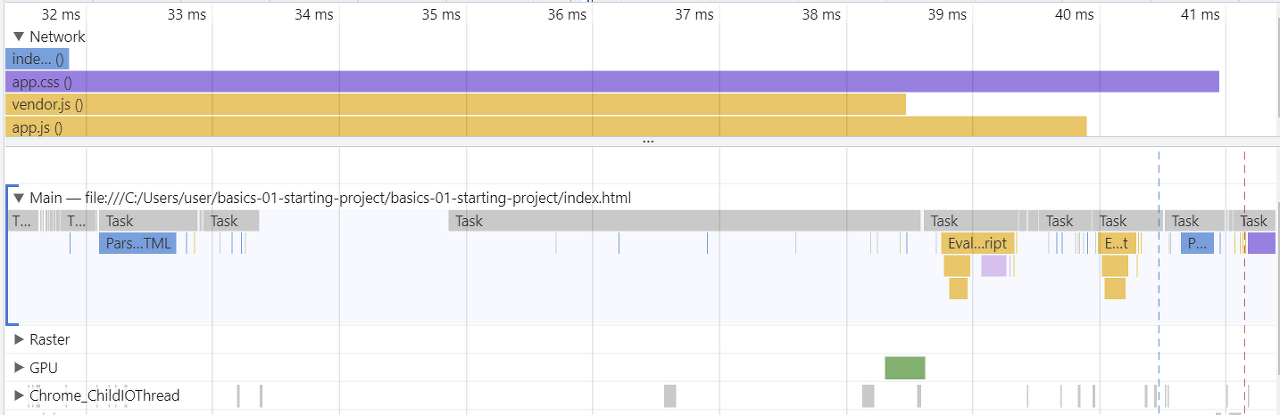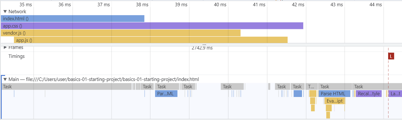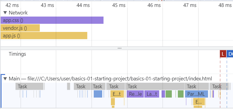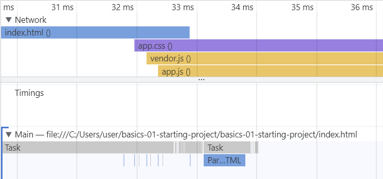 먼저 Network를 보면 index.html 파일을 먼저 다운로드하고 app.css 파일과 js 파일을 다운로드하였음을 볼 수 있다. 그리고 Main에서 브라우저의 작업을 보면 다운로드된 index.html 파일을 받고 로딩이 끝난 후에 HTML 코드의 구문 분석을 시작하는 것을 볼 수 있다. 구문 분석이 끝난 후에는 js 파일로 요청을 보낸다. 이때 js 파일보다 css 파일이 먼저 전송된 것을 볼 수 있는데 이는 head 섹션에서 css 파일을 요청하기 때문이다. js 파일은 body 섹션에서 요청하기 때문에 css 파일보다 늦게 요청된 것이다. 이는 js 파일이 구문 분석 후에 실행된다는 장점이 있지만 파일이 커지게 되면 로드하고 실행하는 시간이 길어져서 HTML 파일과 js 파일 실행 사이에 일시정지가 발생할 수 있다. js 파일이 HTML 코드에 의존하기 때문에 구문 분석 후에 실행해야 하지만 이와 같이 하면 전과 같은 상황이 발생할 수 있다. 이는 로딩이나 서버에서 미리 다운로드를 함으로써 해결할 수 있다. 최대한 빨리 스크립트를 로드하고 구문 전체가 분석된 후에 실행되도록 하는 방법이 해결 방법이다. 이 방법을 알아보기 위해 코드를 수정해보자.