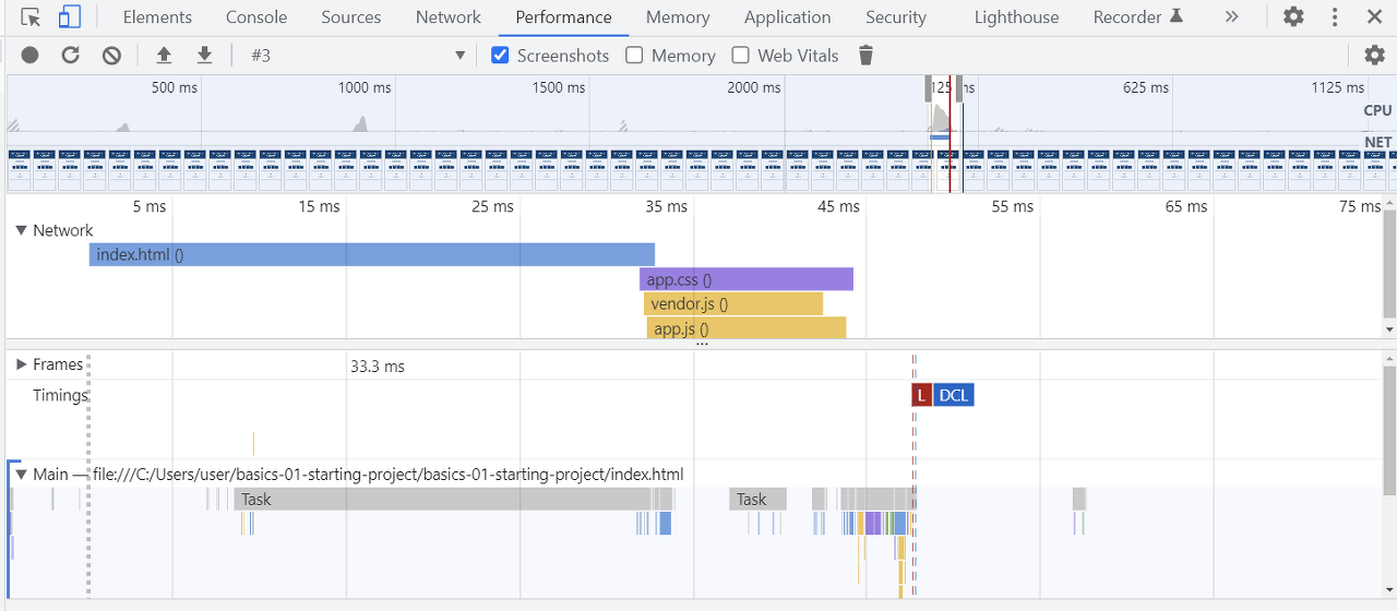 또한 performance의 main에서는 브라우저의 작업을 자세히 살펴볼 수 있다.