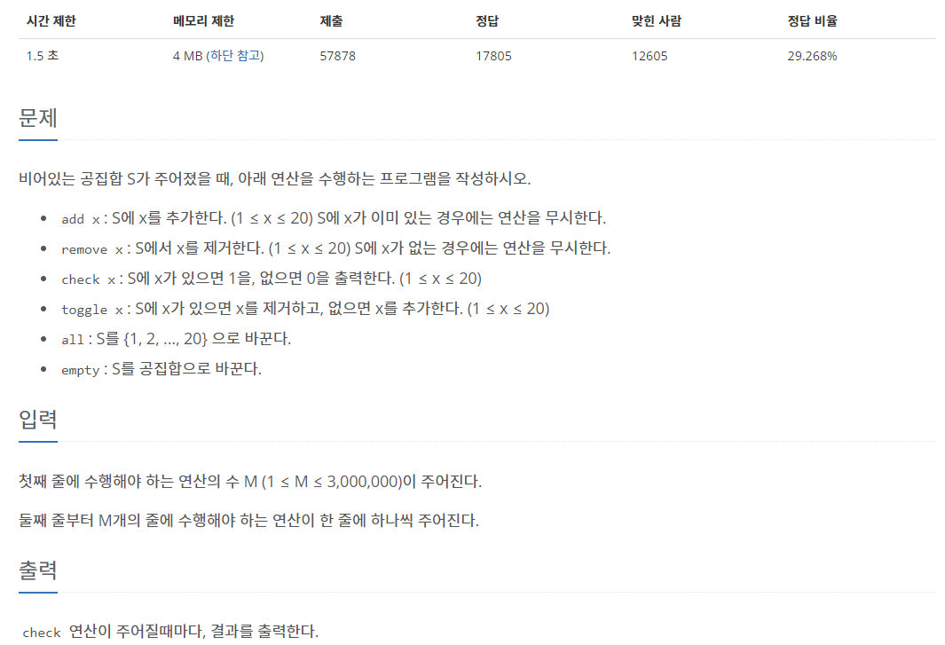 원래 비트마스크 문제이지만 집합 자료형 set을 이용하여 먼저 풀어보았다.