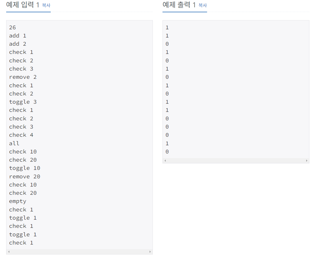 먼저 명령어와 숫자를 입력을 받는데 명령어만 입력 받는 경우(empty, all)와 명령어와 숫자를 입력 받는 경우(add, remove, check, toggle)로 나누었다. 그리고 각 명령어에 대해서는 집합 자료형 관련 함수를 사용하여 쉽게 해결할 수 있었다.