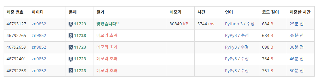 이때까지 pypy3로 제출을 계속 해와서 그것으로 제출을 했었는데 그 답변 글에는 지금까지 pypy3으로 맞았습니다를 받은 사람이 한 명도 없고 현재 메모리 제한으로는 pypy3으로 맞았습니다를 받는 것이 불가능한 것으로 추정된다고 적혀있었다.