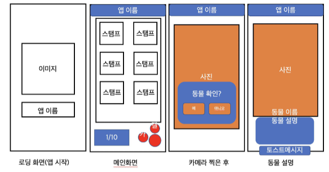 - 동물원 앱 구성(로딩 페이지, 메인페이지(도감), 카메라 & 갤러리, 이미지 분류 확인 페이지, 동물 설명 페이지)과 기능에 대한 논의를 하였다.