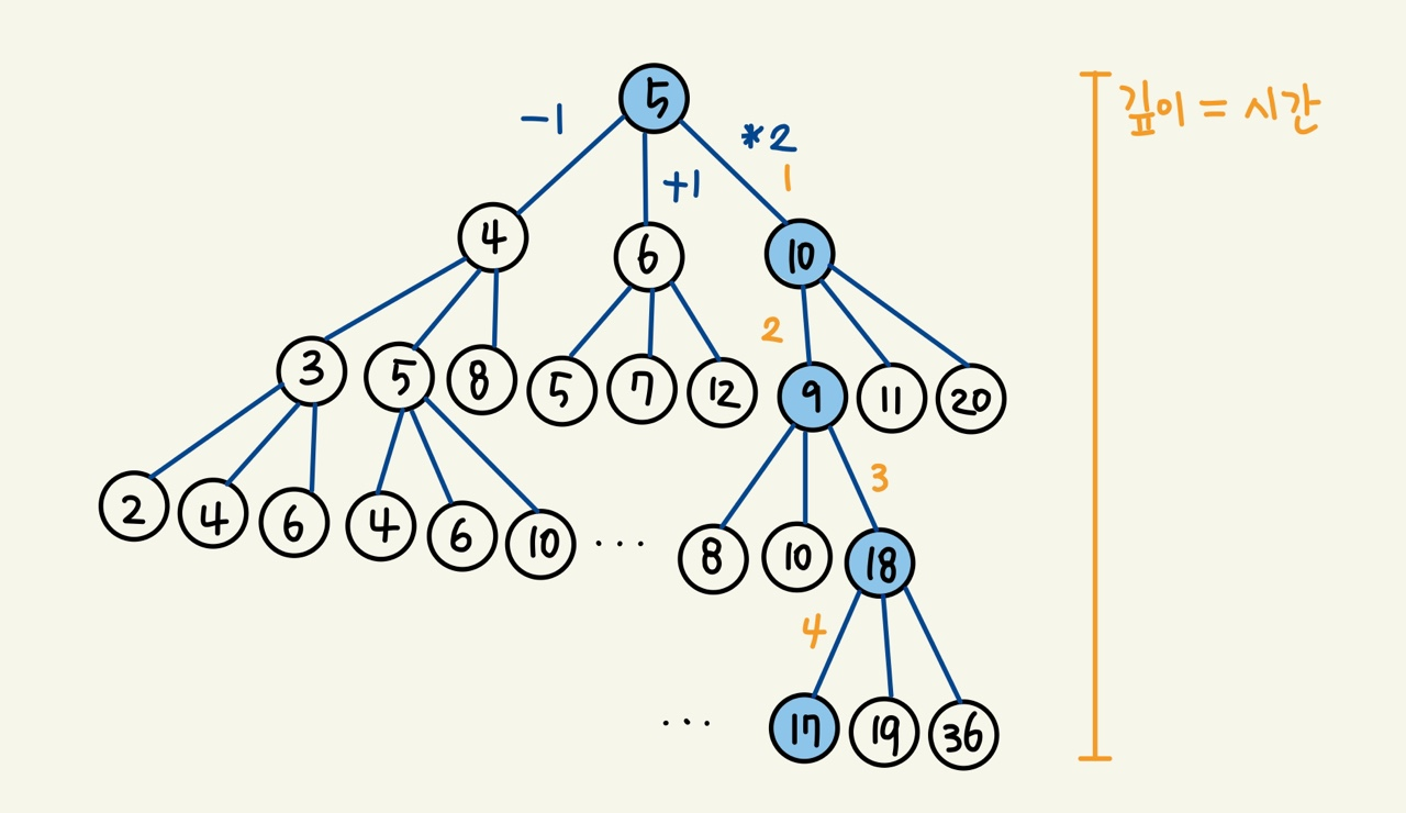 수빈이가 동생한테까지 가는데 수빈이가 한 번에 이동할 수 있는 거리는 x - 1, x + 1, x * 2가 있고 이를 그래프로 만들어 BFS 알고리즘을 통해 해결할 수 있다.