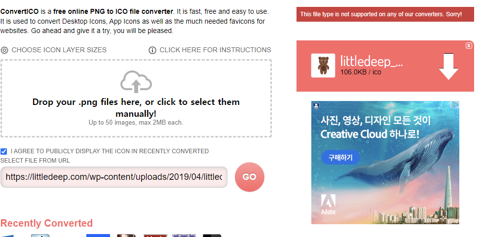 ICO를 포토샵으로도 만들 수 있지만 PNG를 ICO로 바꿔주는 사이트 이용해서 변경해줌