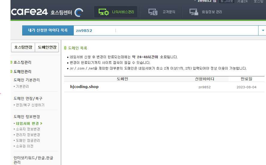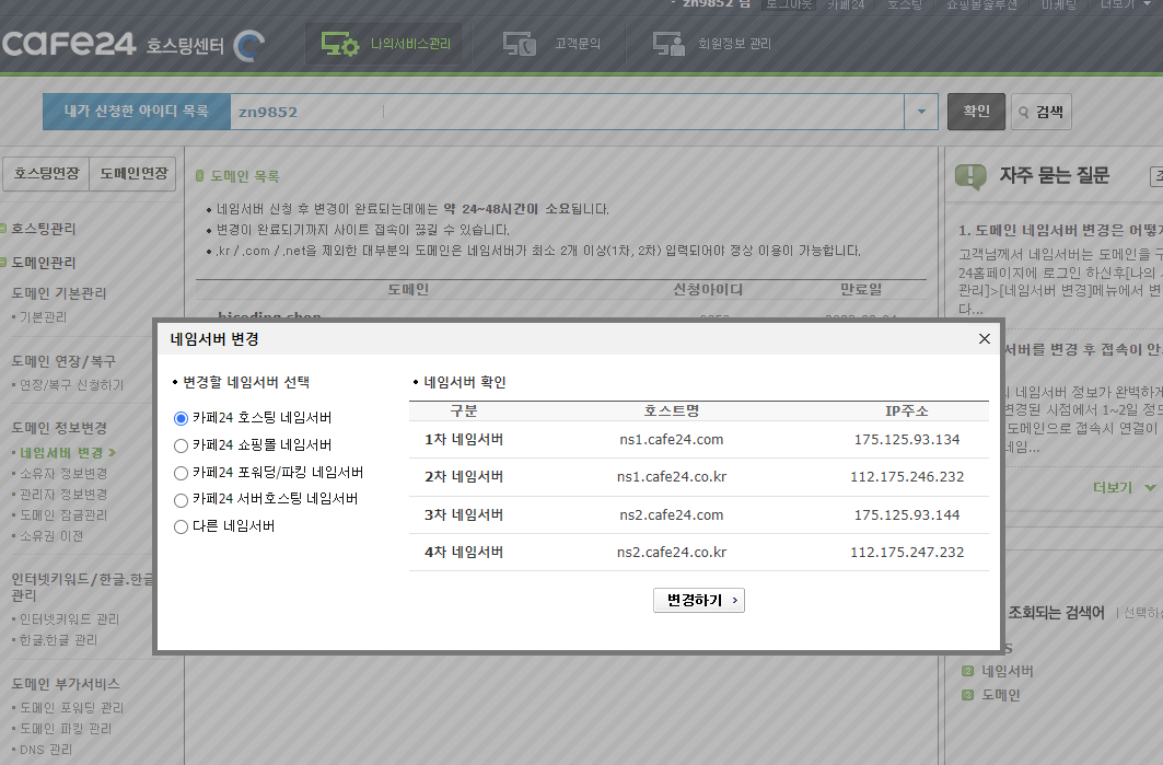 1. 다시 cafe24 들어가서 네임서버 변경 클릭