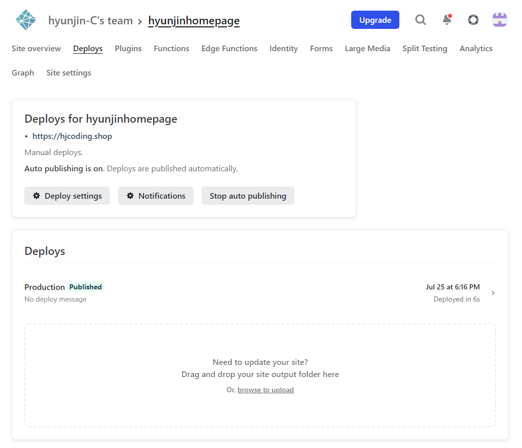 netlify에서 deploys에 들어가 public_html 파일을 deploys에 드래그하여 update를 해준다.