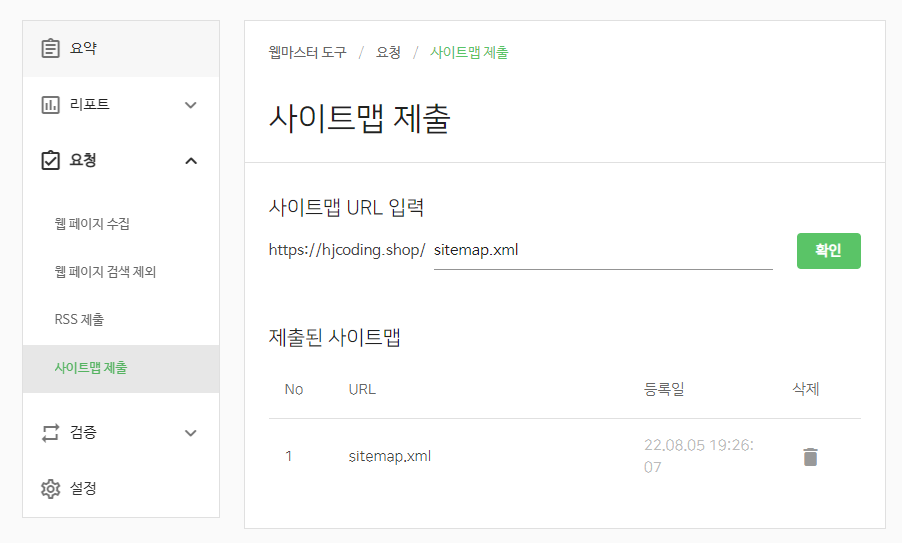 요청>사이트맵 제출에서 URL 입력에 sitemap.xml을 입력하고 확인 버튼을 눌러주면 네이버 봇 Yeti가 들어와서 이 사이트를 잘 찾을 수 있게 된다.