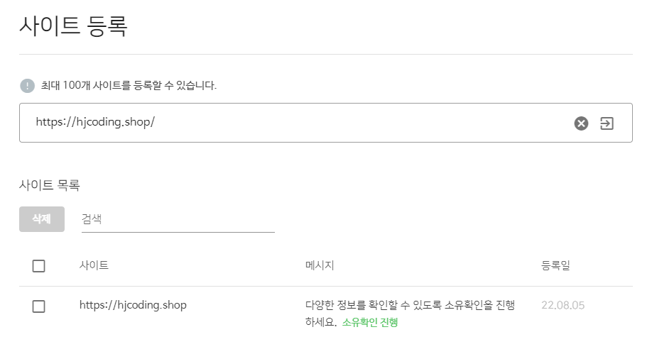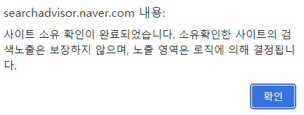 6. 위 과정을 다한 후에 소유 확인 버튼을 누르면 사이트 소유 확인이 완료된다.