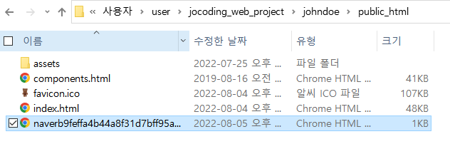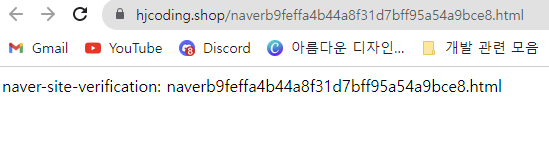 (3번 과정) https://hjcoding.shop/naverb9feffa4b44a8f31d7bff95a54a9bce8.html를 클릭하여 HTML 확인 파일이 업로드되었는지 확인한다. 다음과 같은 화면이 뜨면 업로드된 것이다.