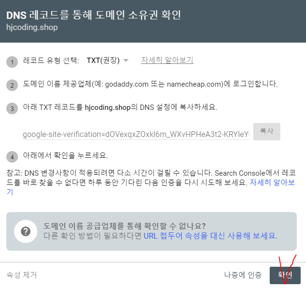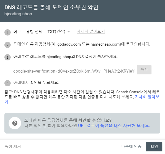 7. 다음과 같이 뜨게 되는데 다시 Google search console의 도메인 소유권 확인 창을 확인해서 그 과정대로 해준다.