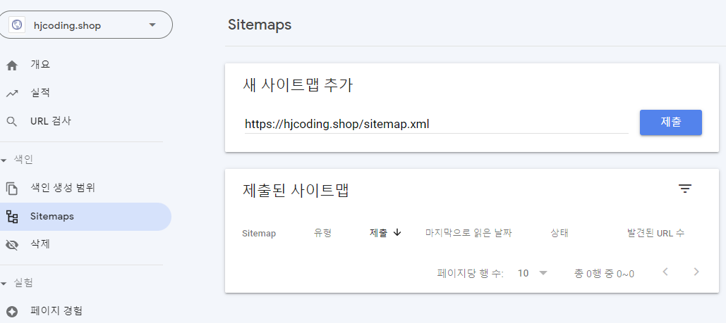도메인과 sitemap.xml을 추가하여 제출을 해준다.