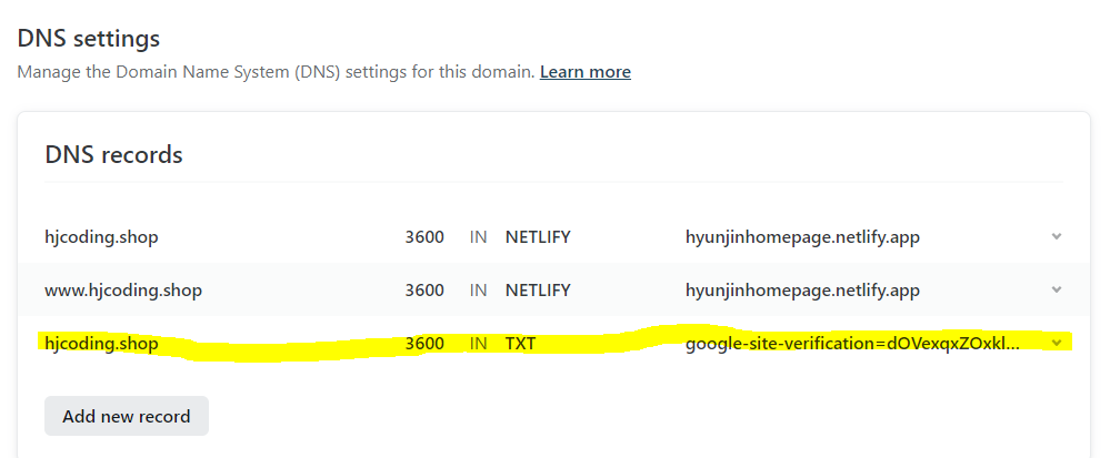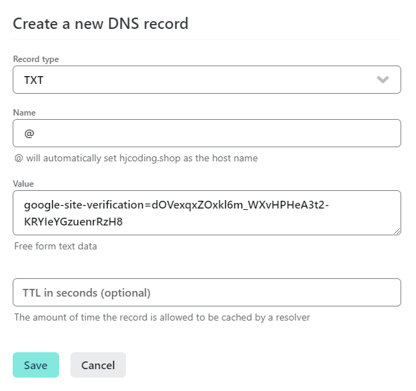 그러면 hjcoding.shop에 txt라는 타입으로 구글에서 알려준 값을 넣을 수 있게 된 것이다.