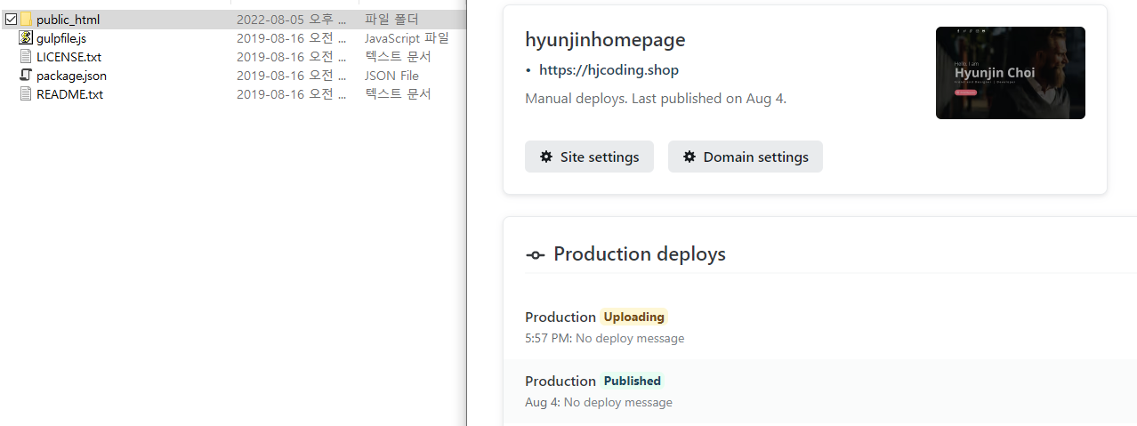 그다음 HTML 확인 파일을 서버에도 반영시키기 위해 다시 netlify에 들어가 수정한 폴더를 업데이트를 해준다.