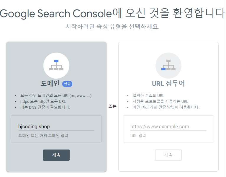 2. 시작하기를 누르면 다음과 같이 뜨게 되는데 도메인을 입력하고 계속 버튼을 누르면 된다.