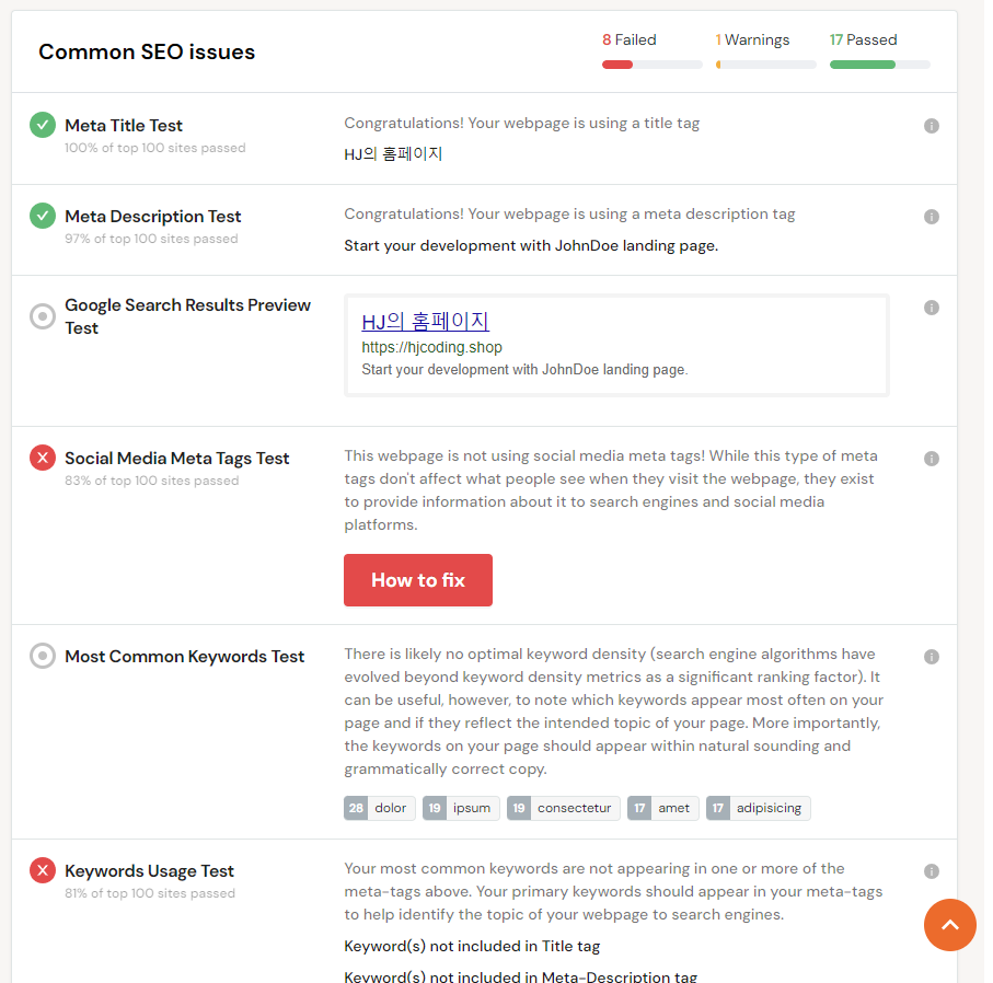 fail로 표시된 것에 How to fix를 눌러 고쳐야 하는 요소가 무엇인지 확인하고 고쳐주면 된다.
