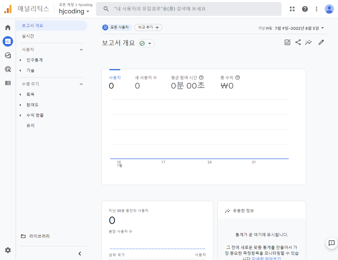 구글 애널리틱스의 보고서에서 분석된 사이트 접속 정보를 확인할 수 있다.