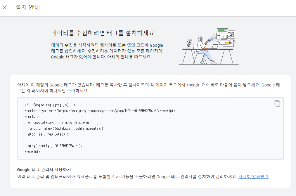 태그 안내 보기를 클릭하면 이와 같이 설치 안내가 뜨게 되고 아래에 코드(태그)가 적혀있다. 그리고 이 태그를 복사한 후에 웹사이트의 각 페이지 코드에서 <head> 요소 바로 다음에 붙여 넣으라고 되어있다.