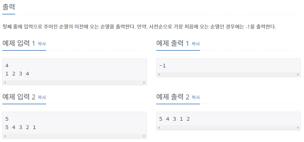 첫째 줄에 입력으로 주어진 순열의 이전에 오는 순열을 출력한다. 만약, 사전순으로 가장 처음에 오는 순열인 경우에는 -1을 출력한다.