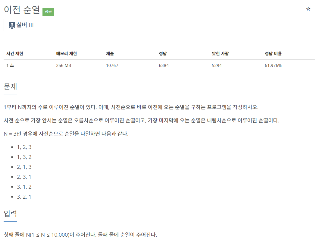 이 문제는 이전에 풀었던 백준 10972번 다음 순열 문제와 거의 비슷한 문제이다.
