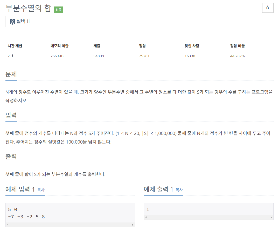 첫째 줄에 정수의 개수를 나타내는 N과 정수 S가 주어진다. (1 ≤ N ≤ 20, |S| ≤ 1,000,000) 둘째 줄에 N개의 정수가 빈 칸을 사이에 두고 주어진다. 주어지는 정수의 절댓값은 100,000을 넘지 않는다.
