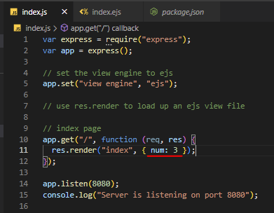 어떤 값을 response에 담아서 보낼 때 대괄호 안에 객체를 담아서 보내면 ejs 파일에서 받을 수 있다.