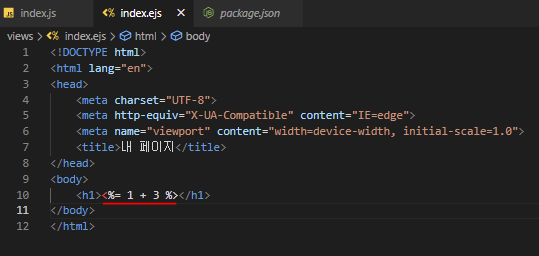 7. index.ejs 파일 안에 html 코드를 작성해준다. (ejs도 결국 html이므로)