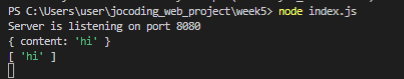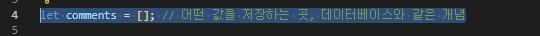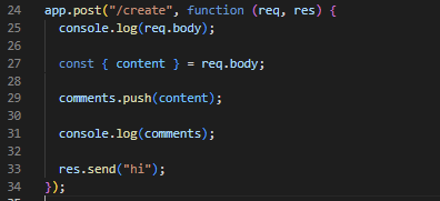 2. content라는 변수에 req.body 값을 넣어주고 comment 리스트에 push한다. (제대로 값이 넣어졌는지 확인을 위해 comments를 출력해본다.)