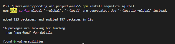 1. sequelize 공식 사이트에 있는 모듈 설치 방법에 따라 sequelize와 sqlite3 npm 모듈 2개를 vscode에 설치해준다.